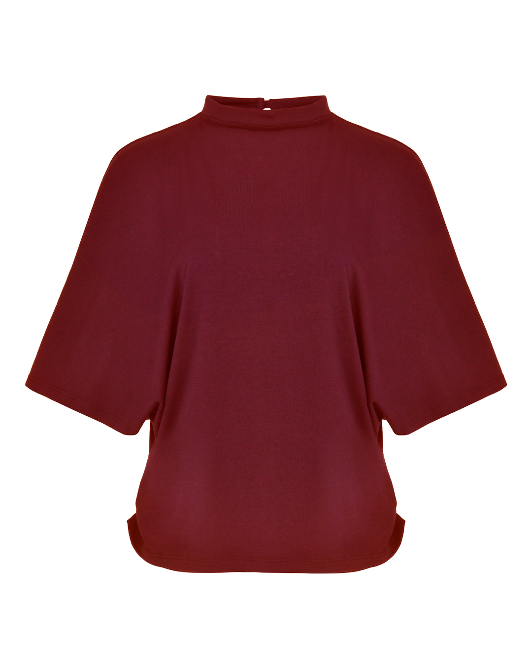Top de manga corta confeccionado en tejido ligero y suave. Presenta una silueta relajada con caída natural, cuello cerrado y líneas limpias que aportan un aire minimalista y moderno.
