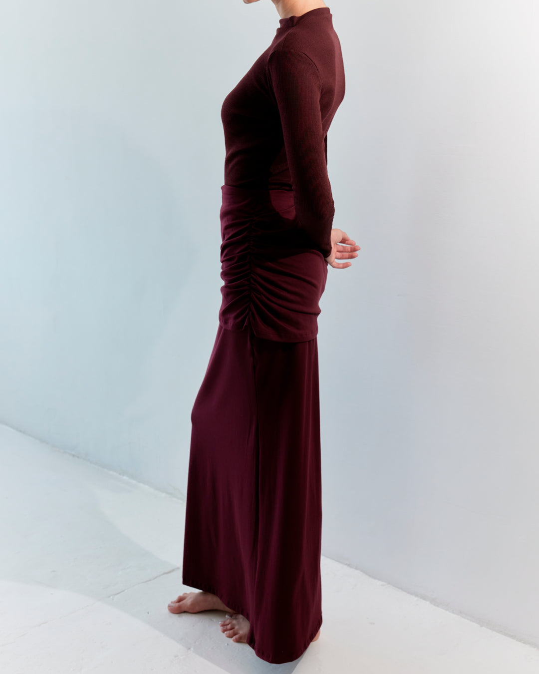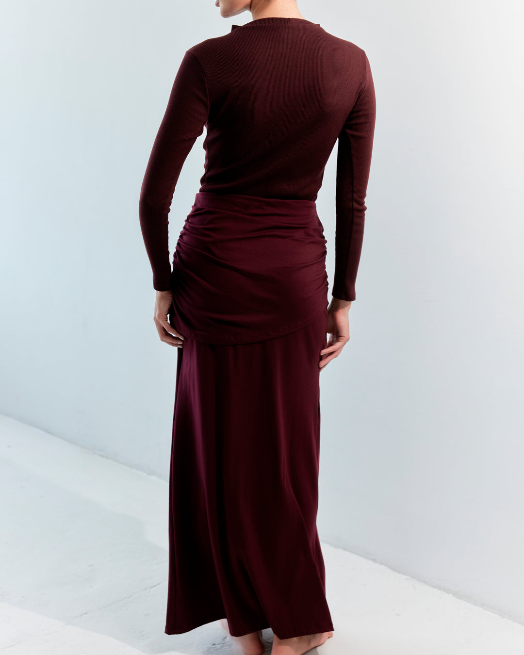 Esta falda es larga y elegante, con un diseño de corte recto y caída fluida hasta el suelo. En la parte superior presenta un detalle de drapeado o fruncido lateral que envuelve la cadera de forma asimétrica, creando volumen y realzando la figura. El frunce se concentra principalmente en un costado, dando un efecto visual de movimiento y sofisticación. Es una pieza ideal para un look refinado, que combina estructura y suavidad con un toque moderno y femenino.
