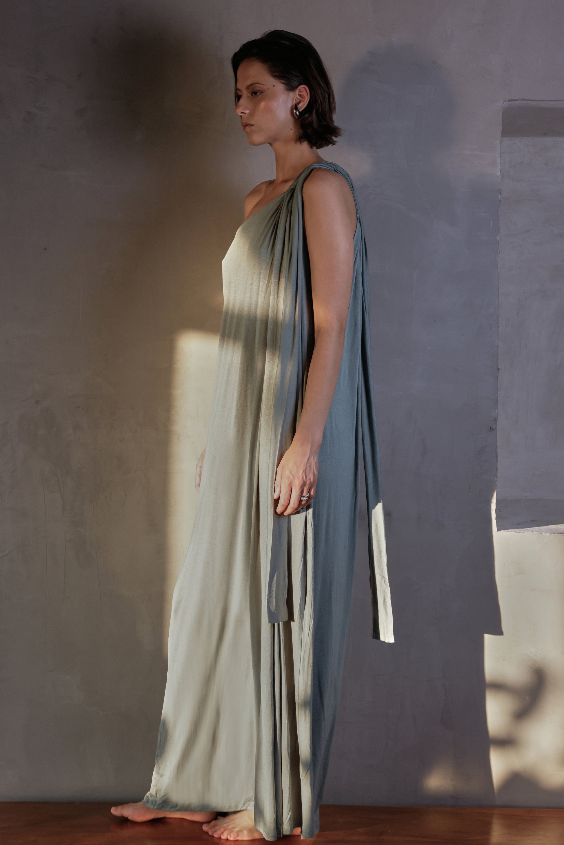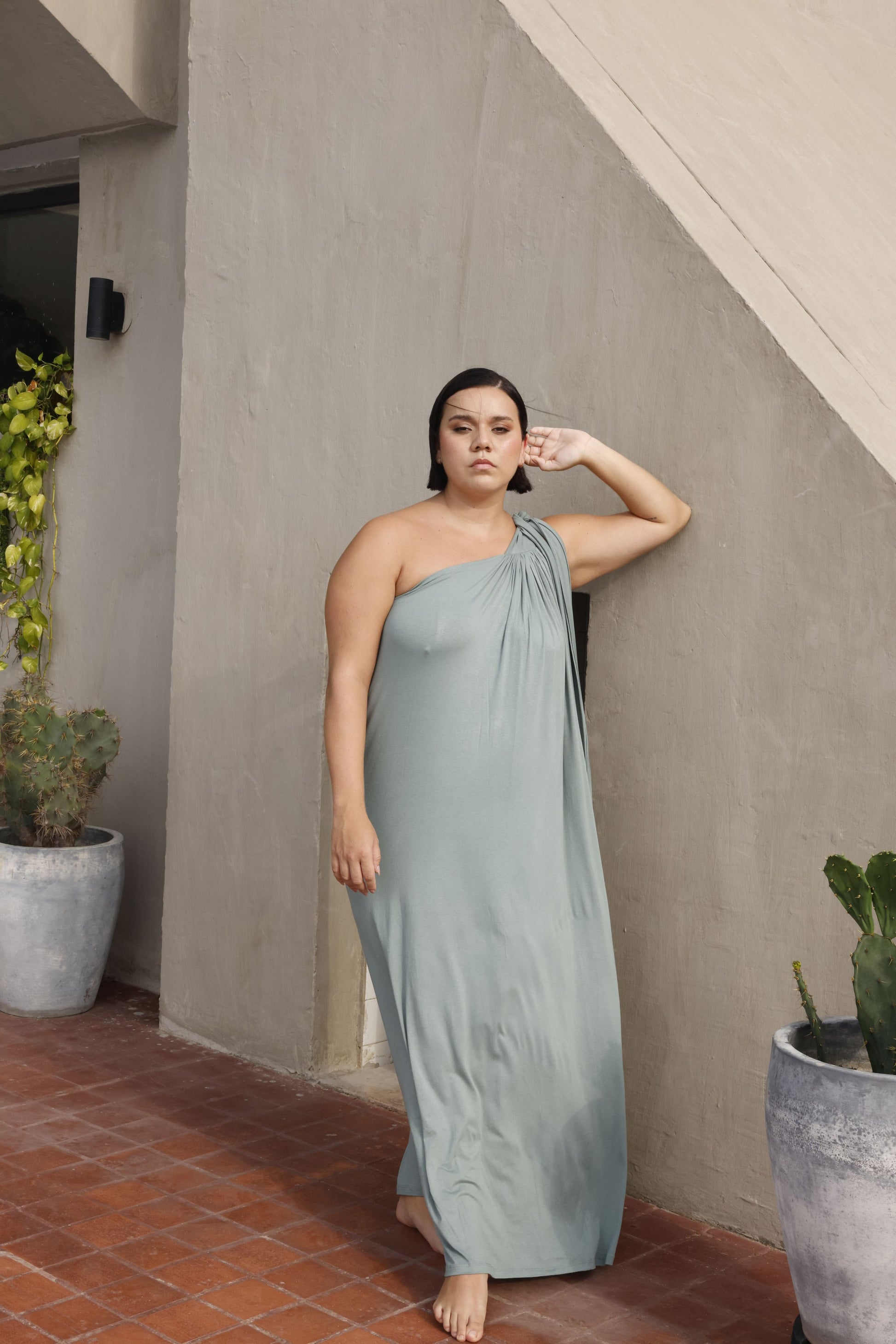 Un vestido fluido de largo hasta el suelo, con un solo hombro en tono blanco roto, que presenta suaves pliegues en el hombro y un elegante drapeado que cae por el costado. Minimalista, atemporal y de una gracia effortless.
