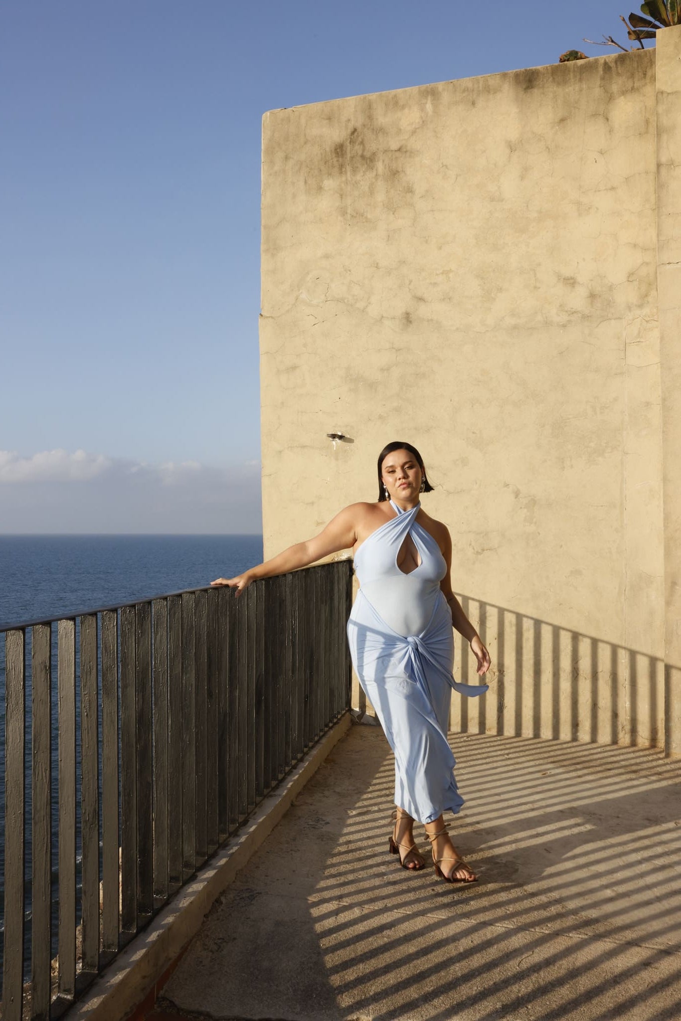 Este vestido es una impactante prenda en azul periwinkle claro con cuello halter, confeccionado en una tela suave y fluida que cae elegantemente sobre el cuerpo. Presenta un escote profundo que aporta un toque sensual y sofisticado, equilibrado por el detalle fruncido en la cintura que se anuda en un prominente lazo al frente. El lazo crea un hermoso efecto fruncido que se desliza hacia una falda suavemente cascada con un drapeado asimétrico, realzando el movimiento y alargando la silueta. La tela abraza la figura en los lugares correctos, mientras que el lazo y el detalle del drapeado otorgan una elegancia fresca, casi como de resort. Perfecto para noches cálidas, eventos de destino o ocasiones veraniegas elevadas.