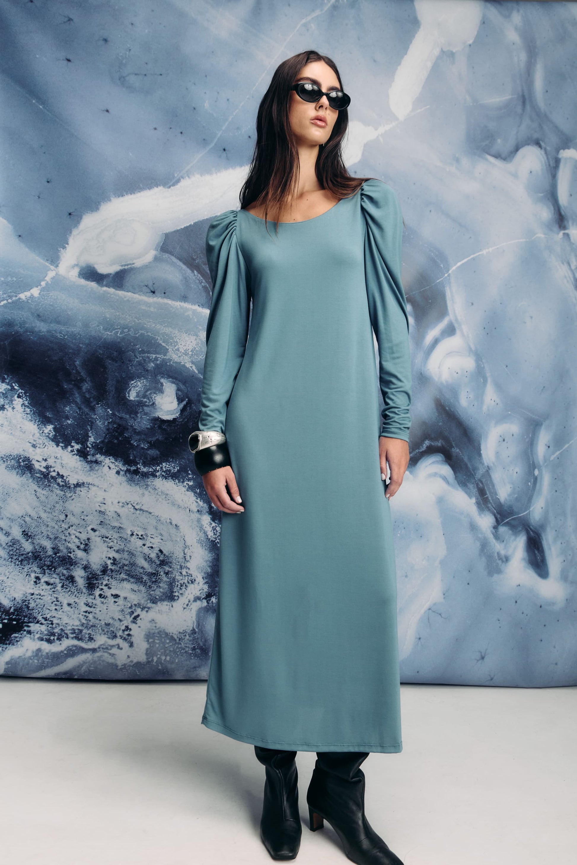 Vestido de manga larga con mangas abullonadas y largo hasta el tobillo. Este vestido combina una silueta clásica con un giro audaz y femenino. Las mangas abullonadas y voluminosas agregan un toque de estilo, mientras que el largo midi lo mantiene elegante y atemporal. Perfecto para destacar con gracia y estilo.