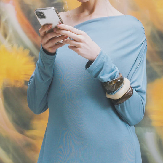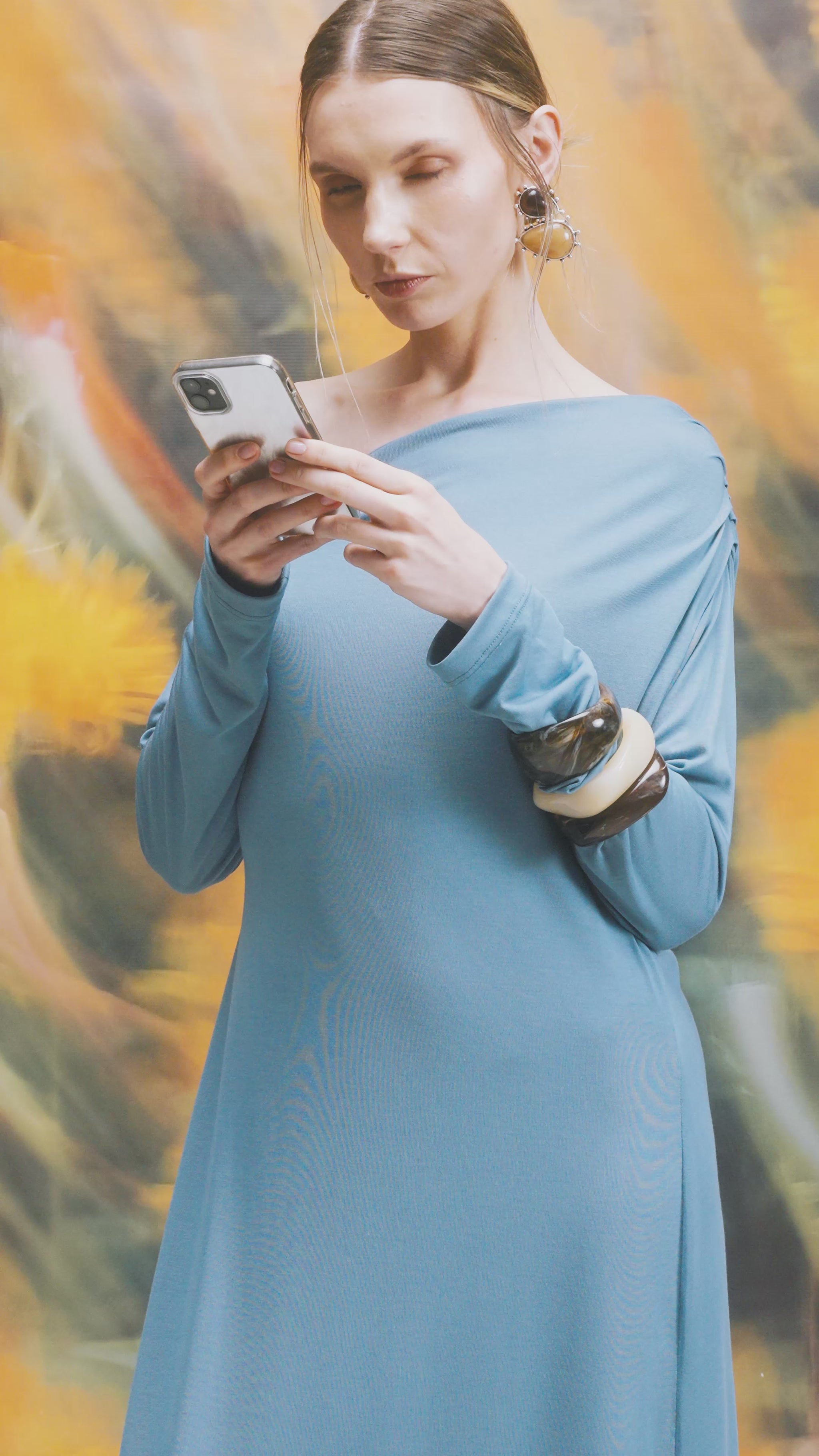 Vestido de hombros caidos drapeados, con silueta semi holgada